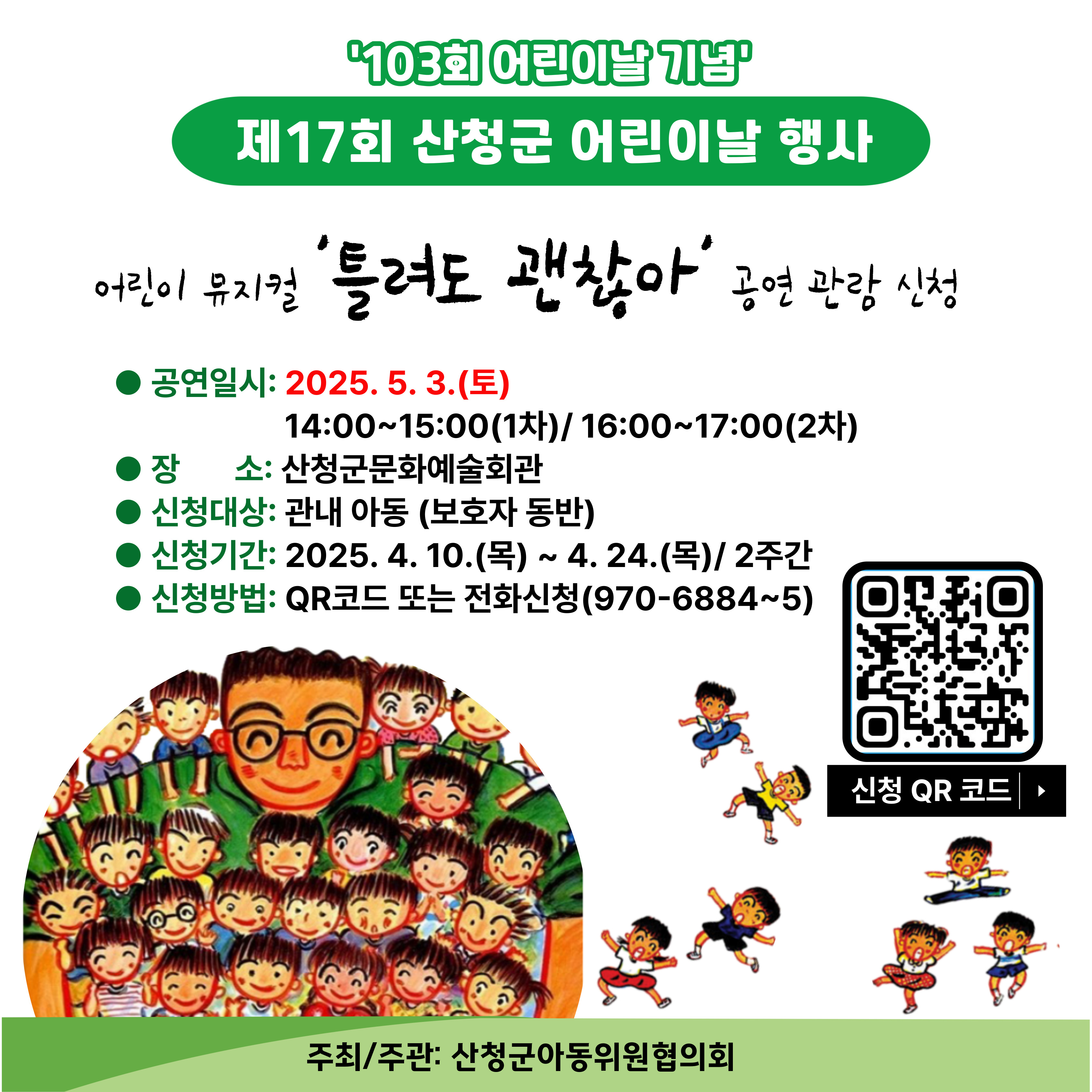산청군의 어린이들에게 특별한 하루를 선물할 ‘제17회 산청군 어린이날 행사’가 다가옵니다! 산청군아동위원협의회가 주관하는 이번 행사는 풍성한 체험과 감동적인 뮤지컬로 꾸며지며, 지역 어린이들의 많은 참여를 기다립니다.